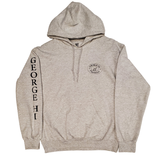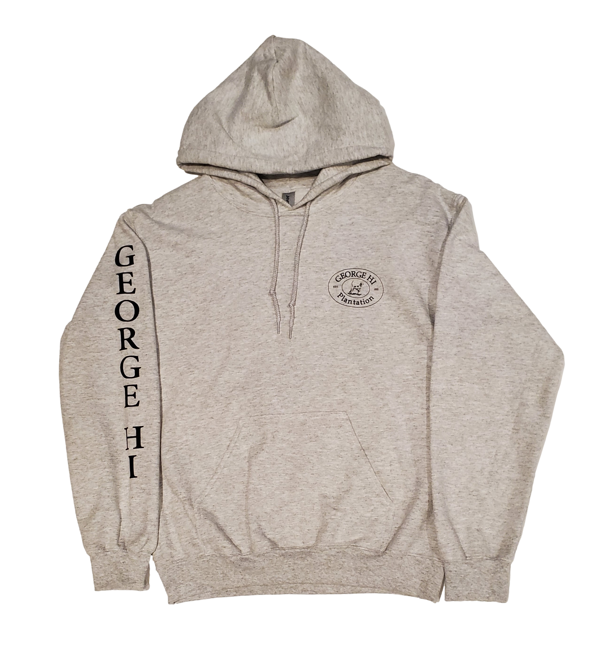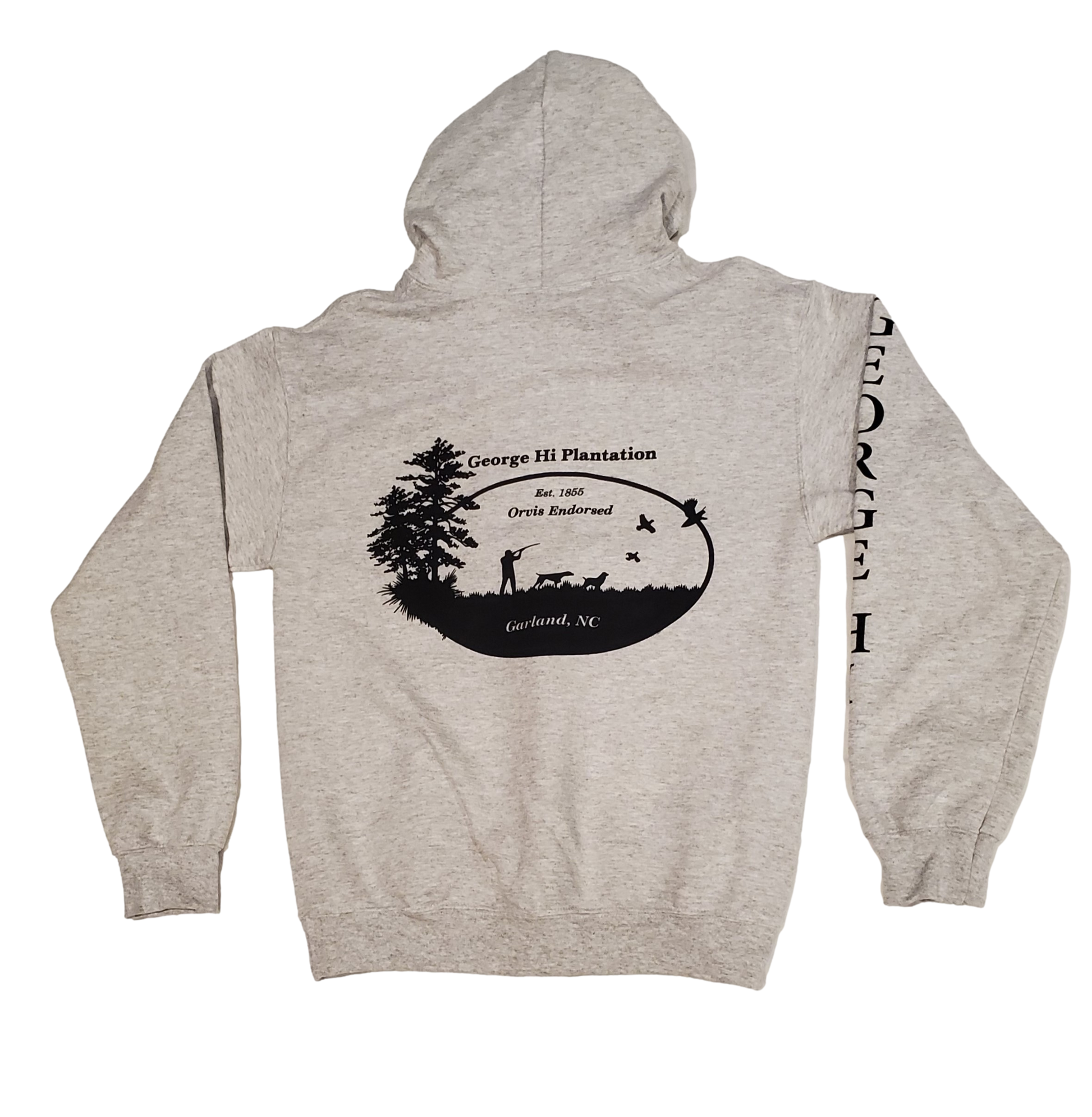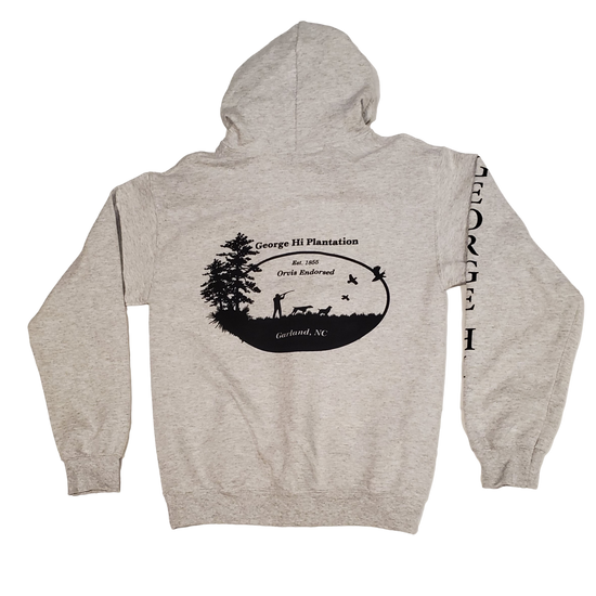 This George Hi Exclusive super soft hoodie has our Logo on Front Left Chest, Name on the Right Sleeve and a black silhouette hunting scene on the back! This awesome in-house design is one of a kind....and only available at George Hi Plantation!