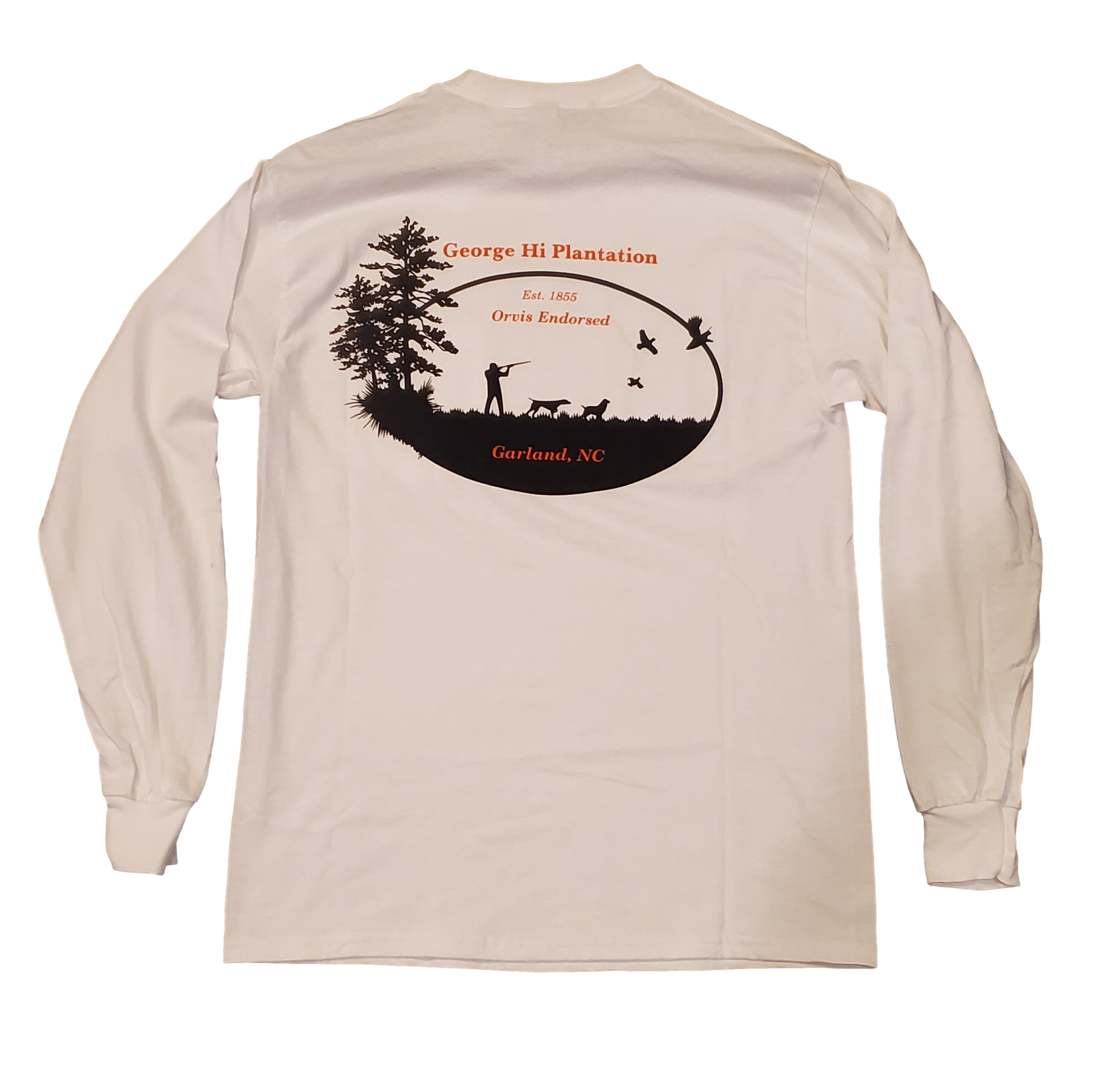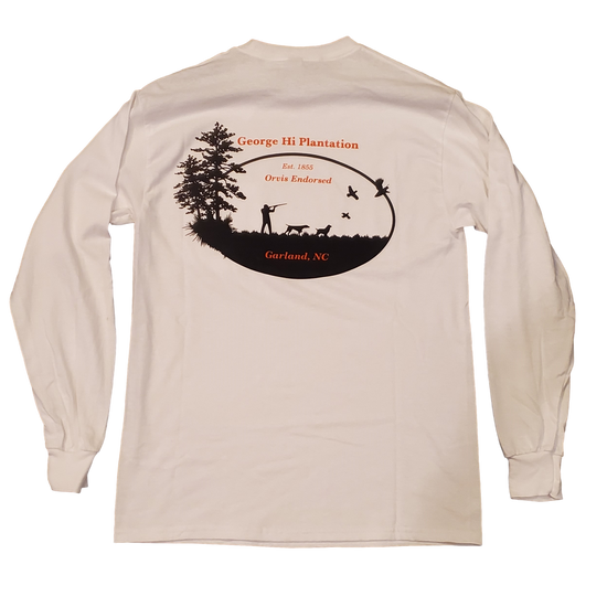 This George Hi Exclusive super soft and comfortable t-shirt has our Logo on Front Left Chest, Name on the Right Sleeve and a black silhouette hunting scene on the back! This awesome in-house design is one of a kind....and only available at George Hi Plantation!