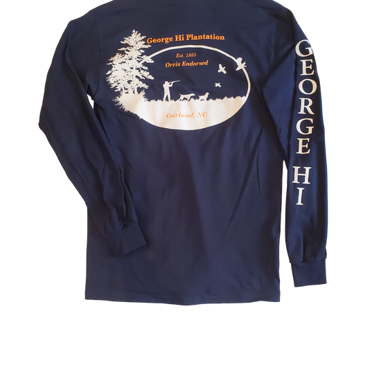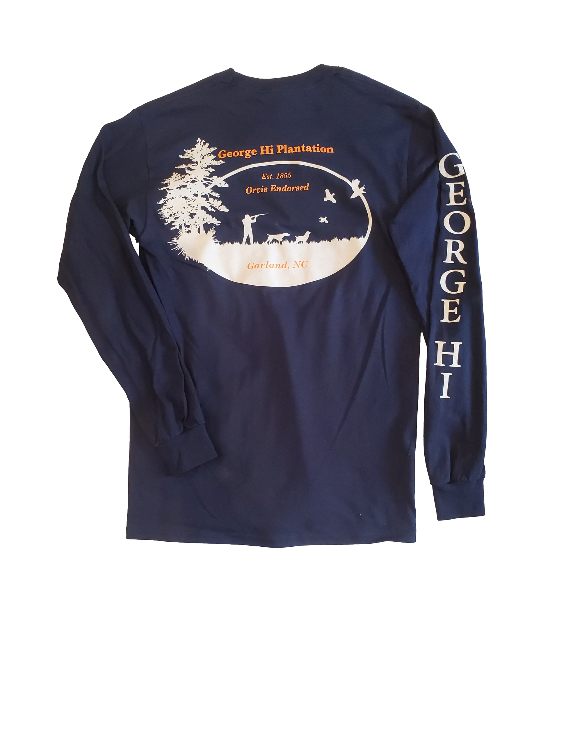 This George Hi Exclusive super soft and comfortable t-shirt has our Logo on Front Left Chest, Name on the Right Sleeve and a white silhouette hunting scene on the back! This awesome in-house design is one of a kind....and only available at George Hi Plantation!